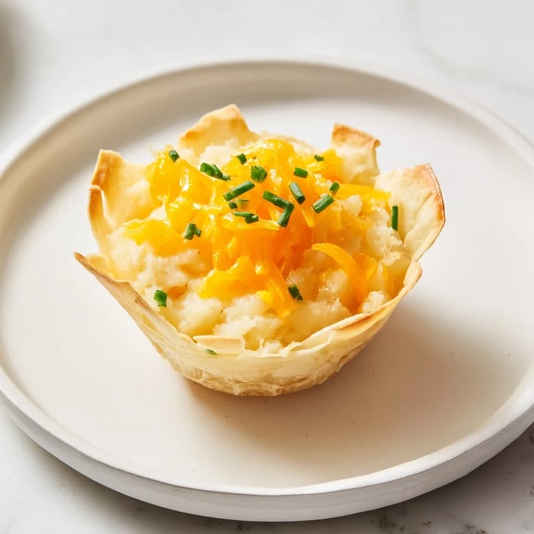 Zapisz Szybka i pomysłowa wersja klasycznych pierogów, te chrupiące pierogi w formie kubeczków przygotowane w frytkownicy powietrznej są wypełnione kremowymi tłuczonymi ziemniakami, smażoną cebulą i serem cheddar — idealne na szybkie przystawki lub przekąskę.