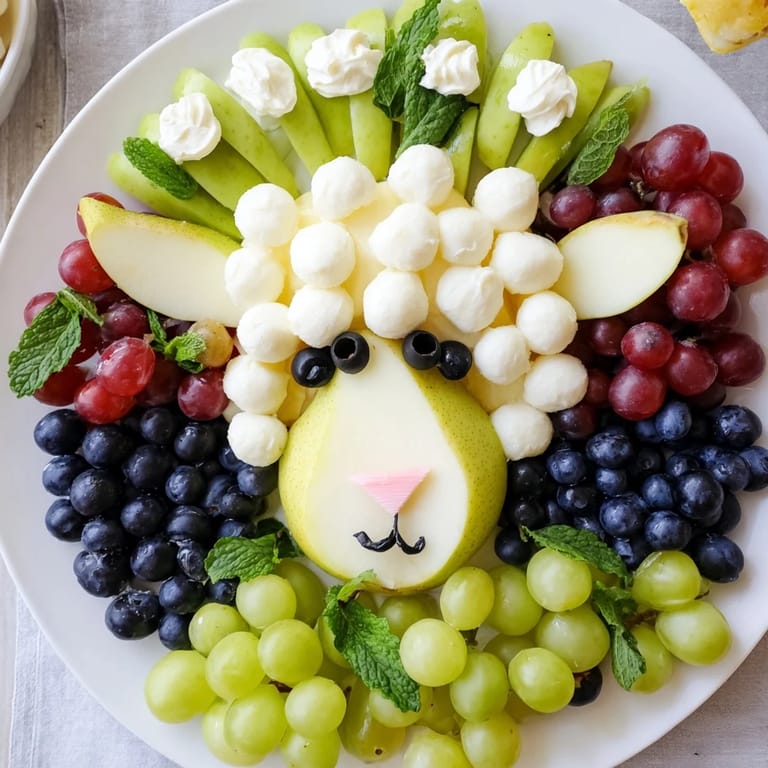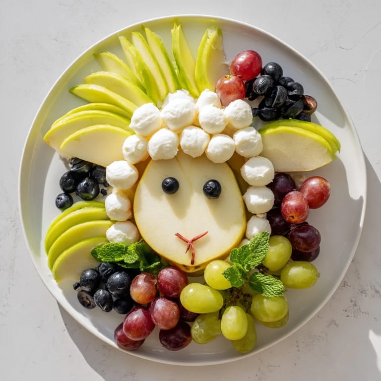 Zapisz Pyszna i zabawna taca z owocami i serami ułożona tak, aby przypominać twarz baranka — idealna na baby shower i świąteczne spotkania.