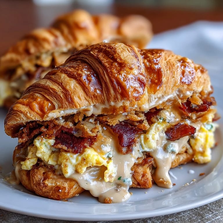 Zapisz There's something about the smell of butter melting in a skillet on a Saturday morning that makes you forget about the week behind you. My neighbor knocked on my kitchen door one weekend, drawn by that exact aroma, and I ended up making these croissant sandwiches for the first time just to have something to offer her with coffee. She bit into that warm, flaky exterior and the way her eyes lit up told me everything—this wasn't just breakfast, it was a moment worth repeating.