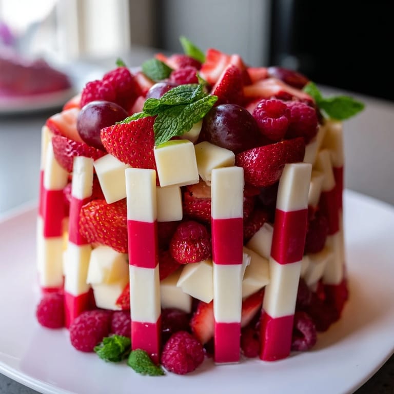 Układaj na przemian paski truskawek, malin oraz winogron z kostkami mozzarelli i sera cheddar, tworząc kształt laski cukrowej. Ważne, by warstwy były wyraźne i równomierne.