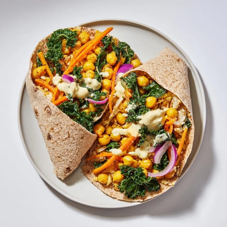 Zapisz Te sycące wrapy z ciecierzycą i zimowymi zielonymi warzywami są pełne rozgrzewających przypraw i kremowego, cytrynowego sosu. Idealne na zdrowy lunch lub lekką kolację w chłodne dni.