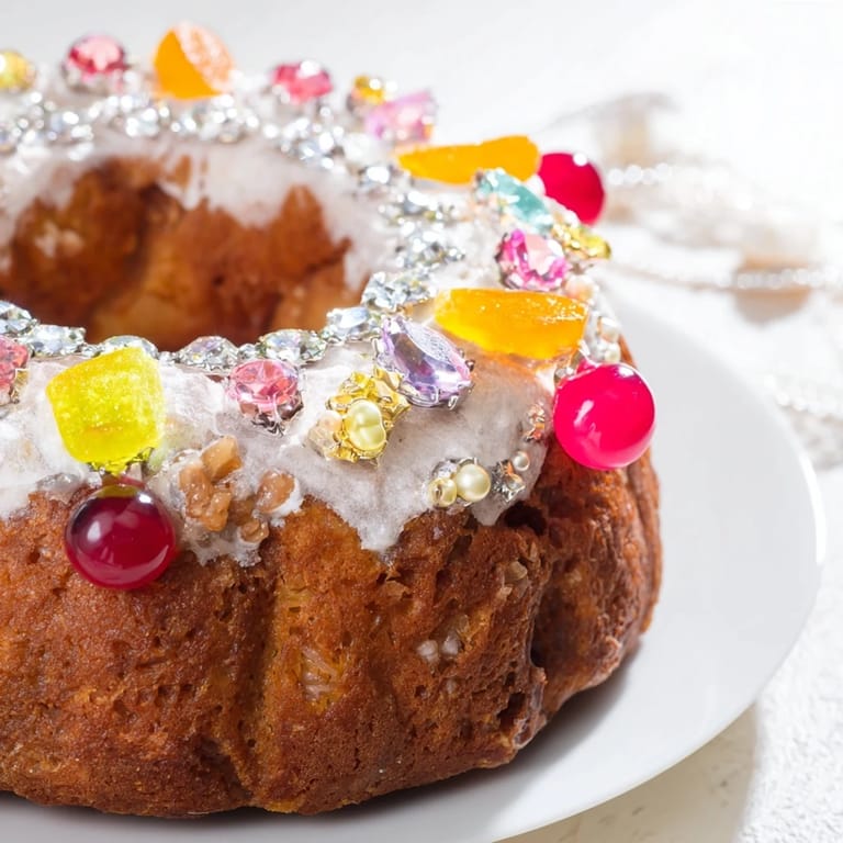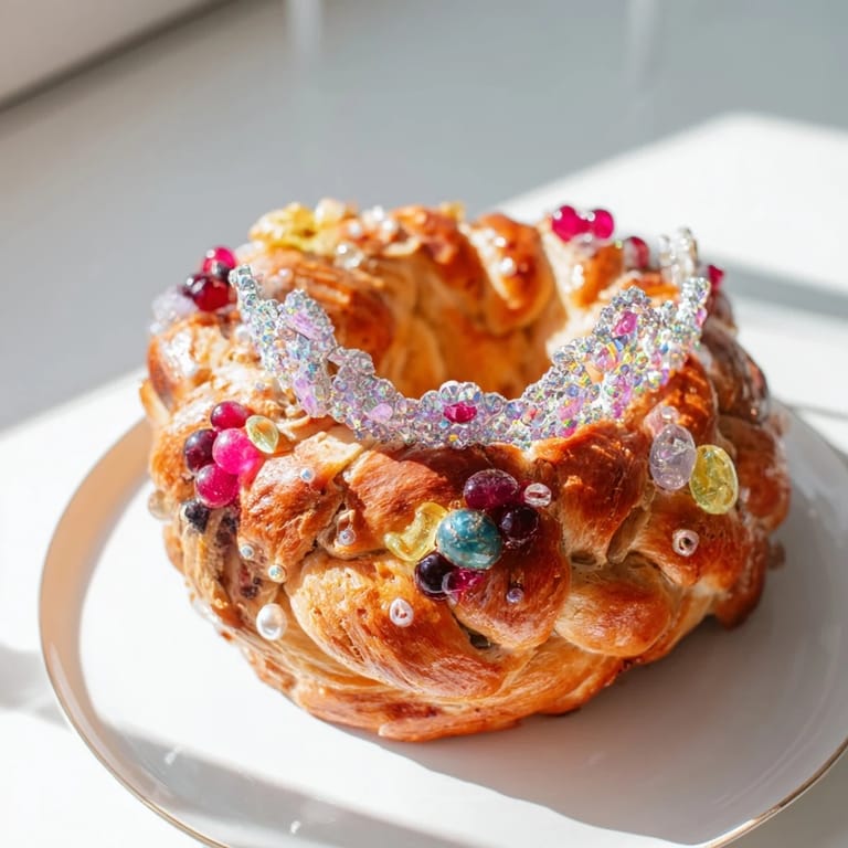 Zapisz Couronne de Roi Bijoux Sucrés to świąteczny i olśniewający słodki chleb w kształcie korony, ozdobiony kolorowymi kandyzowanymi owocami i perłowym cukrem—a wspaniały element dekoracyjny idealny na święta.