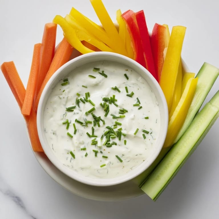 Zapisz Kremowy, kwaśny dip przygotowany z serka śmietankowego i przyprawy ranch, podawany z chrupiącymi, kolorowymi warzywami pokrojonymi w słupki idealny do przekąsek lub na imprezy.