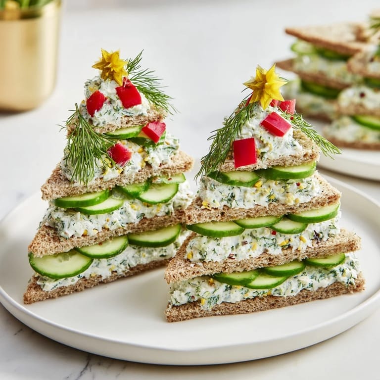 Zapisz Orzeźwiające i pełne uroku, te fantazyjne kanapki warstwowe łączą chłodny ogórek i ziołowy serek śmietankowy w kształt choinki — idealne na przyjęcia, podwieczorki czy spotkania z dziećmi.
