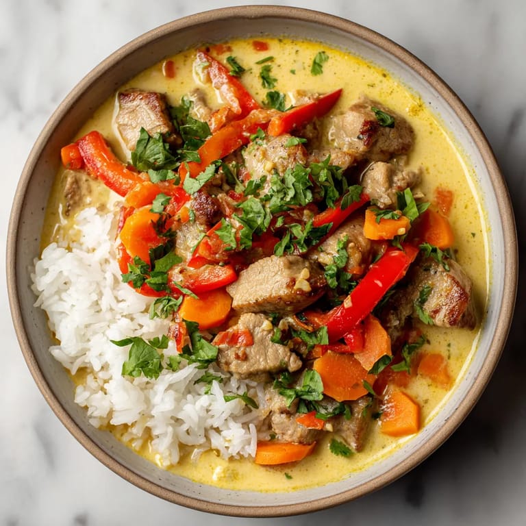 Odkryłam ten przepis podczas podróży po Azji i od razu stał się częstym gościem na moim stole. Początkowo eksperymentowałam z różnymi rodzajami mięsa, ale to właśnie wieprzowina najlepiej przyjmuje intensywne aromaty przypraw curry i mleka kokosowego.