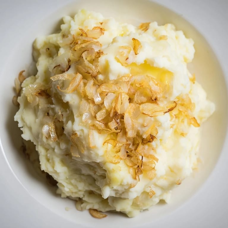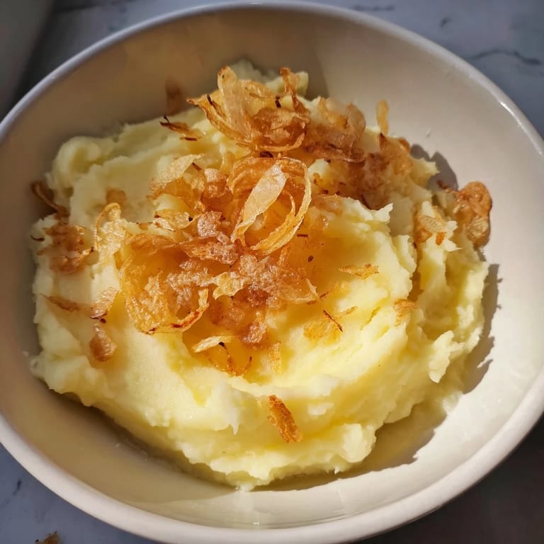 Zapisz Kremowe purée ziemniaczane z pieczonym czosnkiem i chrupiącą smażoną cebulką to klasyczna, pocieszająca przystawka inspirowana tradycją Europy Wschodniej.