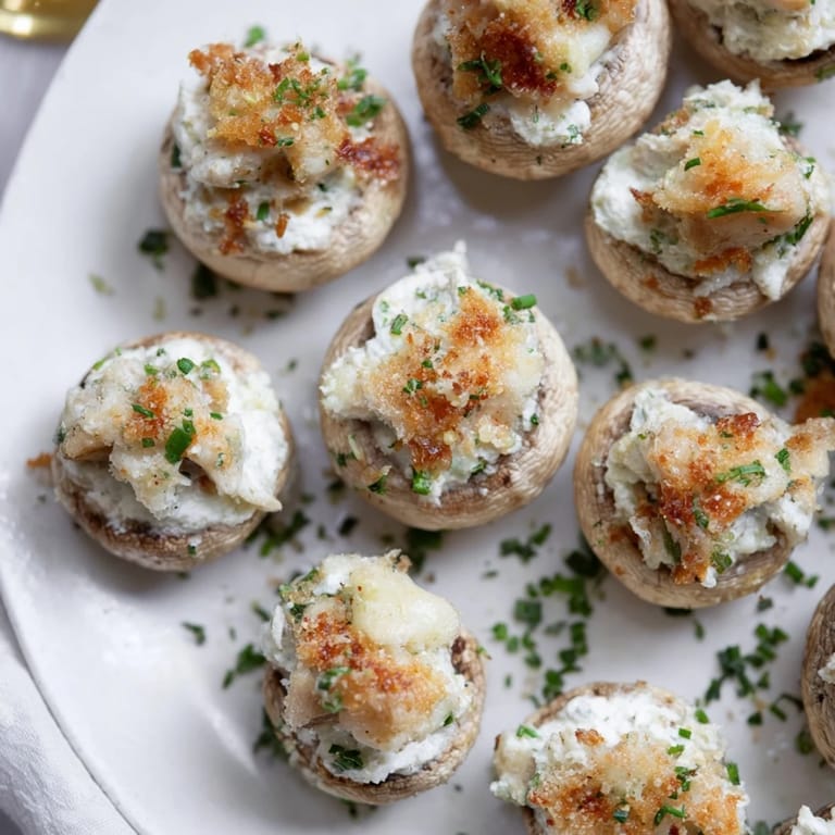Zapisz Kapelusze pieczarek faszerowane ziołowym serem i bułką tartą, ułożone w pierścień, który stanowi efektowną przystawkę idealną na przyjęcia.