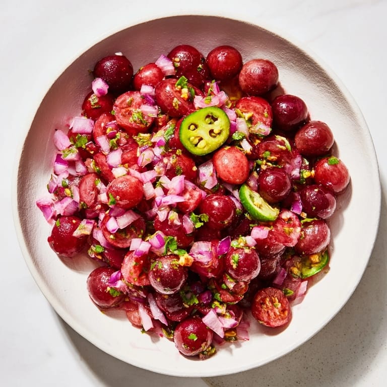 Zapisz Ta wyrazista, fermentowana salsa z winogron i wiśni to prawdziwa eksplozja smaków – słodycz owoców, subtelna ostrość i charakterystyczna kwaskowatość powstała w procesie fermentacji sprawdzą się zarówno jako dodatek do grillowanych mięs lub ryb, jak i kolorowa przekąska do chipsów. Przepis wymaga odrobiny cierpliwości podczas fermentacji, ale efekt końcowy jest absolutnie wart kilku dni oczekiwania.