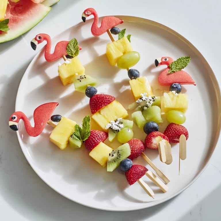 Zapisz Kolorowa, zabawna i zdrowa tropikalna deska owocowa z szaszłykami w kształcie flamingów — idealna na imprezy i letnie spotkania.