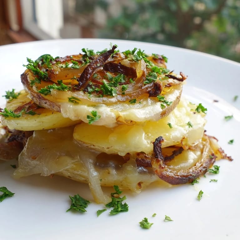 Zapisz Tamtego jesiennego wieczoru, gdy mieszkałam blisko małej kawiarni na rogu, zapach ich przepysznej soupe à l'oignon ciągnął się aż na ulicę. Zawsze myślałam, że coś takiego wymaga godzin pracy i nieskończeńych rondli. Potem odkryłam, że można złapać tę magię w prostszy sposób, warstwując złote placki ziemniaków z karmelizowanymi cebulami i topniejącym serem. To zmienia wszystko, bo dostajesz to samo, głębokie zadowolenie, ale w połowie czasu.