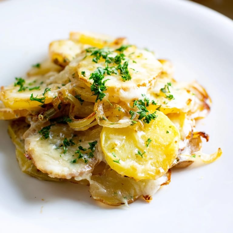 Zapisz There's something almost meditative about watching onions transform in a hot skillet—those papery layers gradually turning from pale cream to deep mahogany gold, filling your kitchen with a sweet, almost caramel-like aroma that makes your mouth water before you've even started eating. I stumbled onto this dish one autumn evening when I had leftover Yukon Gold potatoes and an abundance of onions from the farmers market, and I thought, why not layer them together and let the oven do the heavy lifting? The result was so unexpectedly good—crispy golden potatoes beneath a blanket of jammy onions and melted Gruyère—that it became my go-to side whenever I wanted something that felt both impressive and deeply comforting.