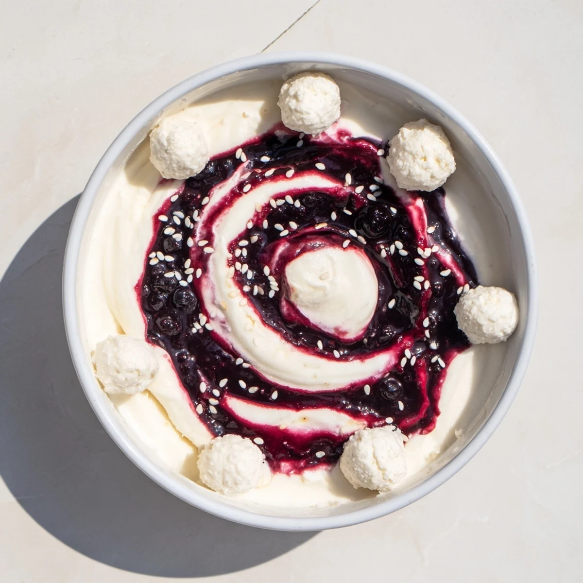 - Delikatnie nalej lub rozłóż ciemny dżem nad jogurtem w spirali lub wirującym wzorze. Pracuj powoli, pozwalając dżemowi tworzyć ścieżkę na białej powierzchni.