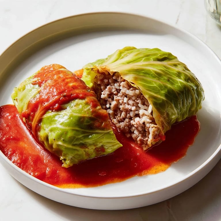 Zapisz Delikatne liście kapusty nadziewane doprawionym mielonym mięsem wołowym i ryżem, duszone w aromatycznym sosie pomidorowym — to pocieszający i niedrogi polski klasyk.