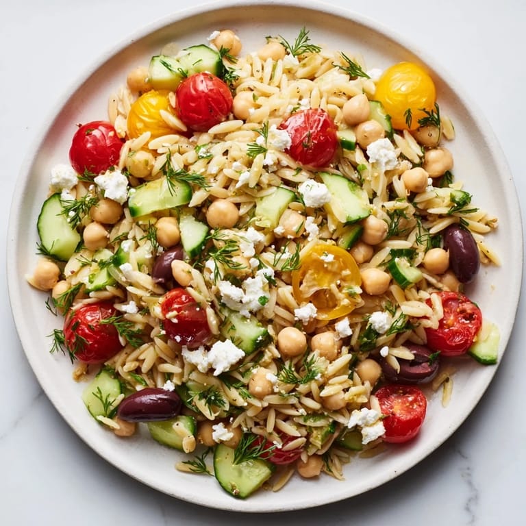 Świeża mieszanka orzo, ciecierzycy i ziół z wyrazistym cytrynowym vinegretem, doskonała na lato.