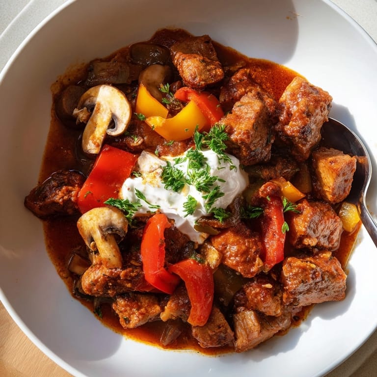 Zapisz Ten sycący polski gulasz wieprzowy rozgrzewa i zachwyca, ilekroć chcę nakarmić rodzinę czymś naprawdę konkretnym i pachnącym. Miękkie kawałki łopatki wieprzowej, słodka papryka, ziemiste pieczarki i treściwy sos paprykowo-pomidorowy – to danie zawsze znika z talerzy do ostatniej łyżki, szczególnie w chłodniejsze wieczory.