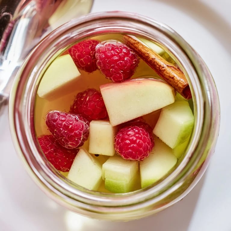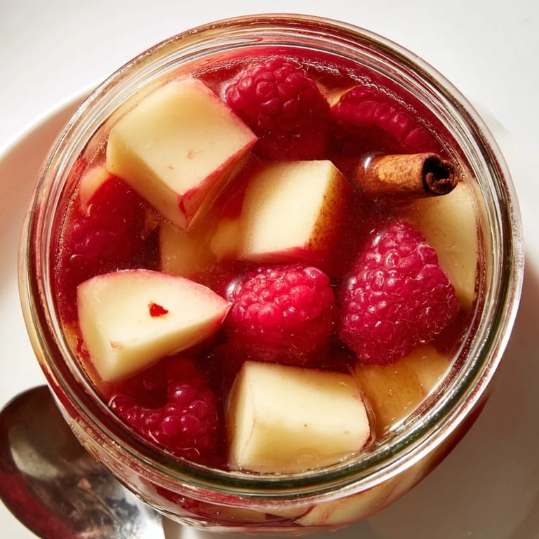 Zapisz Klasyczny kompot jabłkowo-malinowy zamknięty w słoikach to żywy, słodko-kwaśny napój, który pozwala cieszyć się smakami lata przez cały rok. Doskonały na zimno jako orzeźwiający napój lub podany na deser.