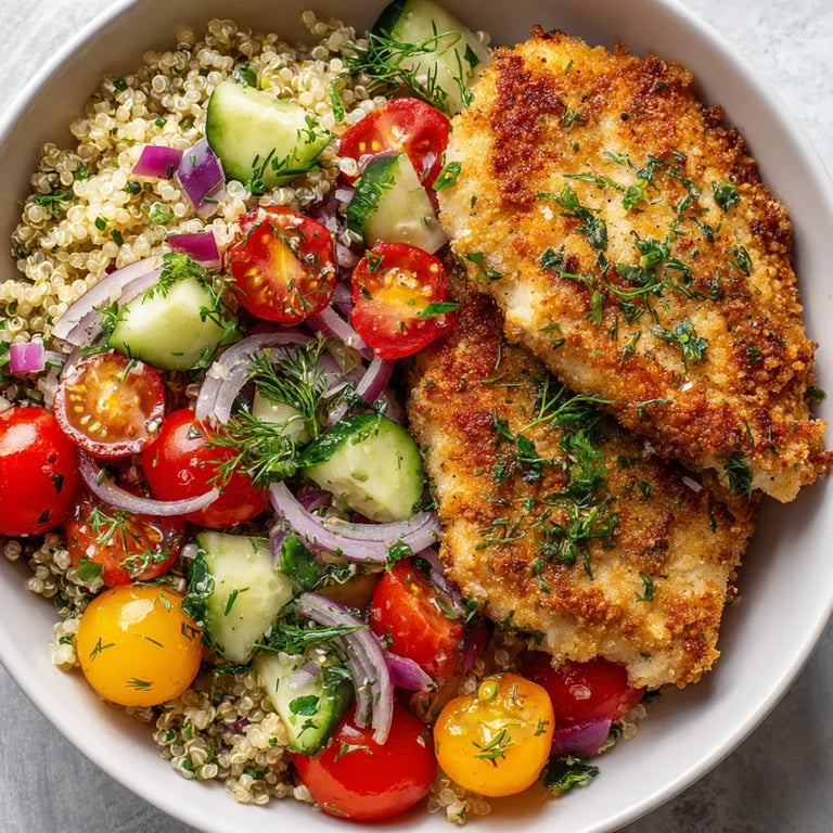 Aromatyczny kotlet z piersi kurczaka, panierowany w ziołach i parmezanie, świetnie komponuje się z lekką sałatką z quinoa. Sałatka łączy soczyste pomidorki koktajlowe, chrupiącego ogórka i czerwoną cebulę, całość skropioną cytrynowym winegretem z miodem i musztardą Dijon. Sprawdza się jako sycący obiad dla czterech osób. Kotlety można usmażyć na oliwie lub przygotować w piekarniku dla lżejszej wersji. Danie doskonale łączy ziołowe aromaty i chrupiące tekstury, gwarantując wyśmienite doznania smakowe.