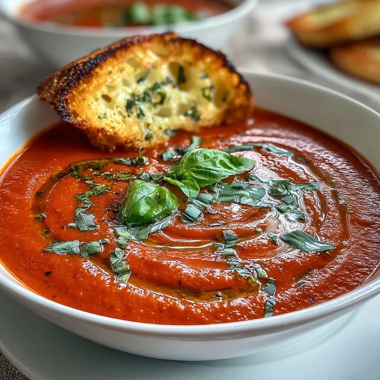 Zapisz There's something about the smell of tomatoes softening in olive oil that makes everything else fade away. My neighbor knocked on my door one October afternoon when my kitchen smelled like this soup, and suddenly we were both standing there, inhaling deeply, and she asked if she could stay for dinner. That spontaneous moment taught me that good food isn't just about following steps—it's about creating something worth sharing. This creamy tomato basil soup became my answer to her unspoken question, and the buttered sourdough dippers turned a simple meal into something neither of us wanted to end.