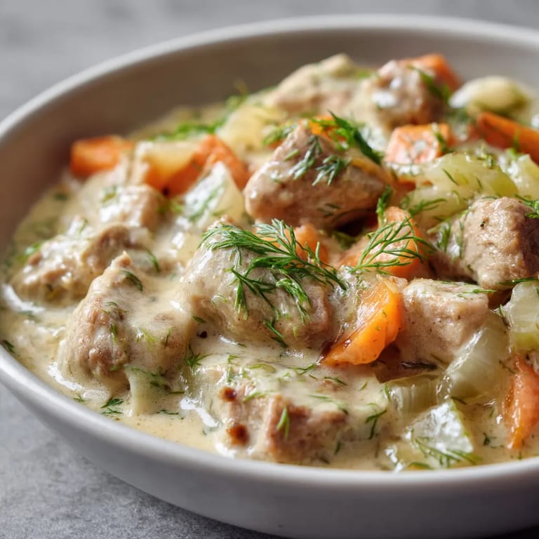 Zapisz Ta kremowa wieprzowina z koperkiem to prawdziwa uczta smaku, która łączy delikatne mięso z bogatym, kremowym sosem i świeżym aromatem koperku. Doskonałe danie jednogarnkowe na chłodniejsze dni, które zadowoli całą rodzinę.