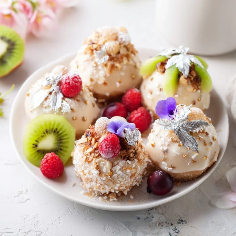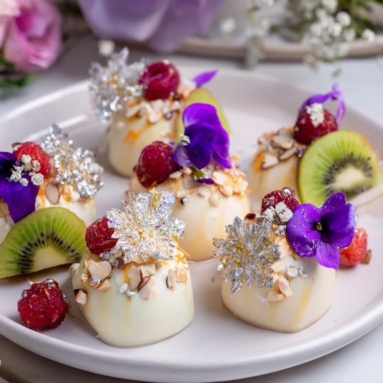 Ułóż mini ciastka, nałóż krem waniliowy, dodaj diamentowe kawałki białej czekolady oraz świeże owoce i jadalne kwiaty dla efektu wizualnego.