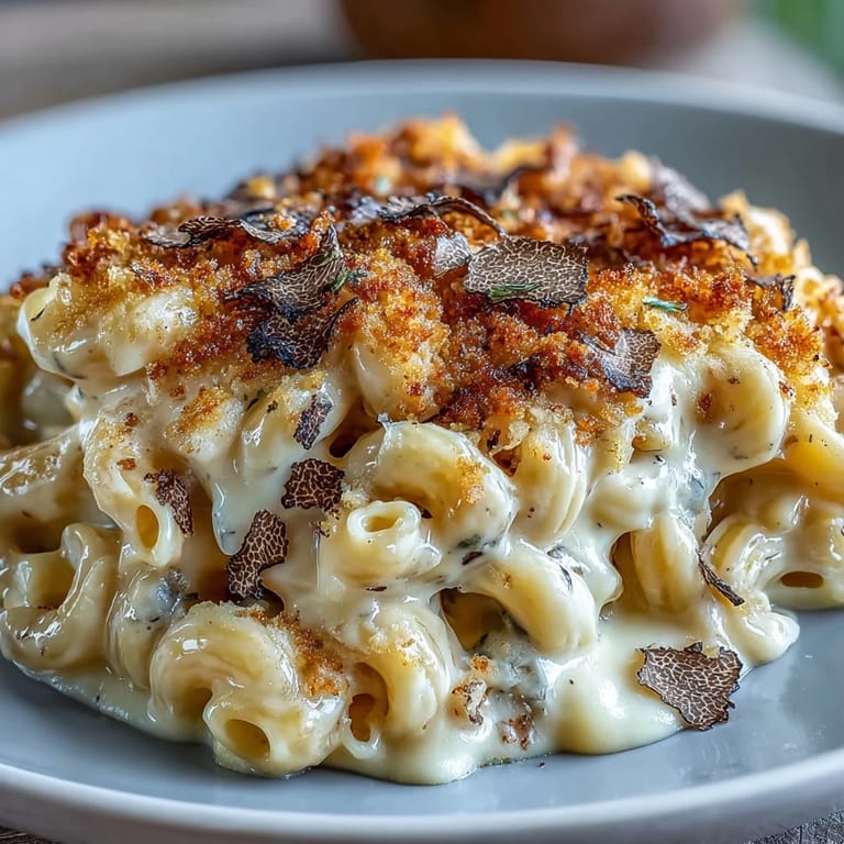 Zapisz Experience the ultimate indulgence with this Truffle Mac & Cheese, a gourmet reimagining of the classic American comfort food. This recipe takes simple elbow macaroni and elevates it with a velvety four-cheese sauce, infused with the earthy, aromatic essence of black truffles and finished with a crisp, buttery panko topping.