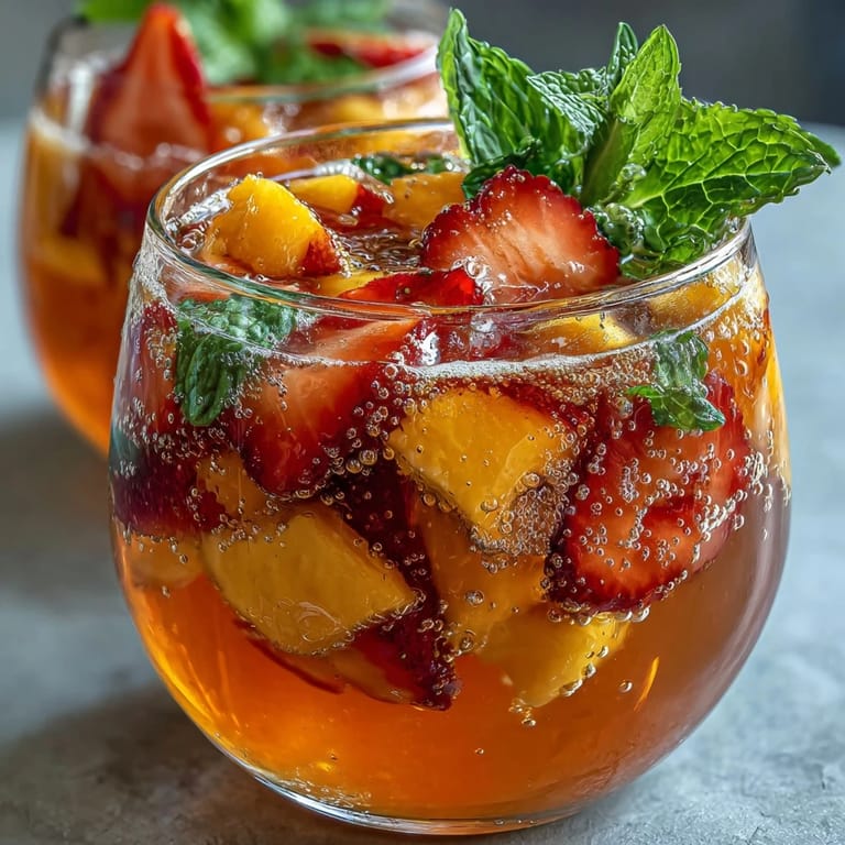 - Tuż przed podaniem dolej schłodzoną wodę gazowaną, ponownie delikatnie przemieszaj i napełnij szklanki lodem, dekorując miętą i świeżymi owocami.