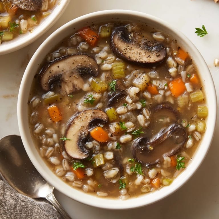 Zapisz Pożywna, sycąca zupa łącząca ziemiste grzyby i orzechową kaszę jęczmienną w aromatycznym bulionie — idealna na komfortowy posiłek.