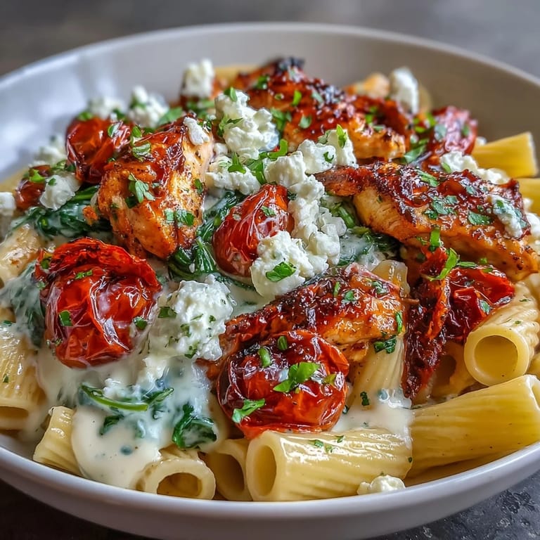 Zapisz Experience a vibrant Mediterranean meal with this Roasted Garlic & Feta Chicken Pasta. This Greek-inspired dish combines tender chicken breasts, sweet roasted garlic, and creamy feta cheese with fresh spinach and cherry tomatoes for a comforting and nutritious dinner.