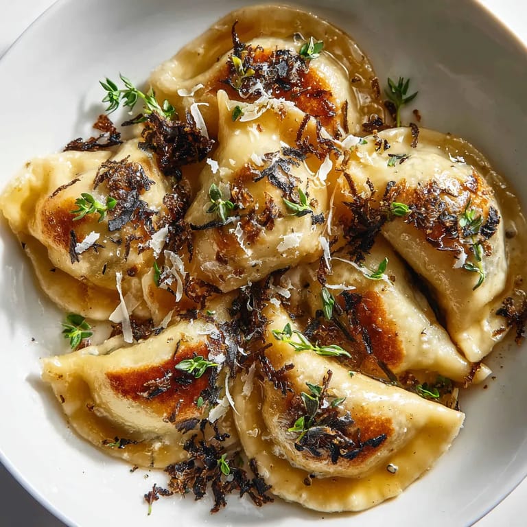 - Gotowe pierogi podawaj natychmiast na ogrzanym talerzu Skrop porcję aromatyczną oliwą truflową Dodaj odrobinę świeżo startego parmezanu lub pecorino i udekoruj posiekanym świeżym tymiankiem
