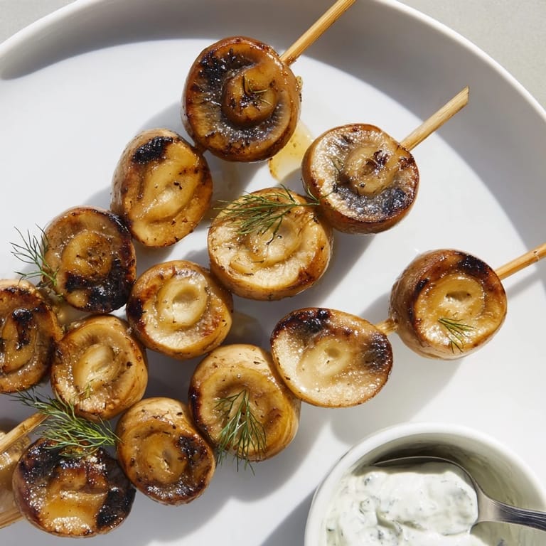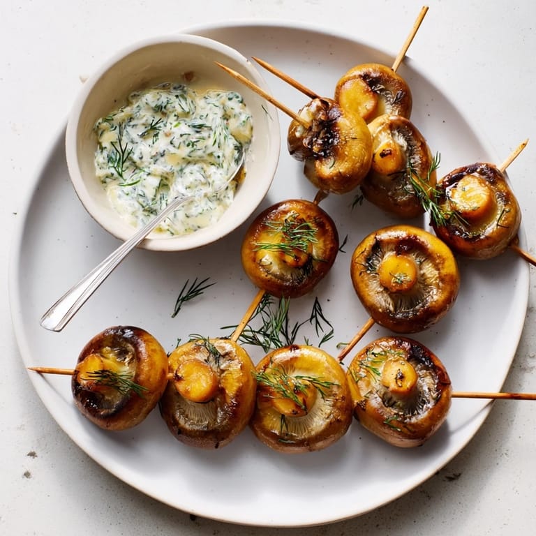Zapisz Kreatywne szaszłyki z pieczarkami marynowanymi w aromatycznych składnikach inspirowanych kiszonym ogórkiem, grillowane i podawane z kremowym dipem z zupy ogórkowej. To pomysłowa przystawka, która zaskakuje smakiem i sprawdzi się na każdej imprezie.