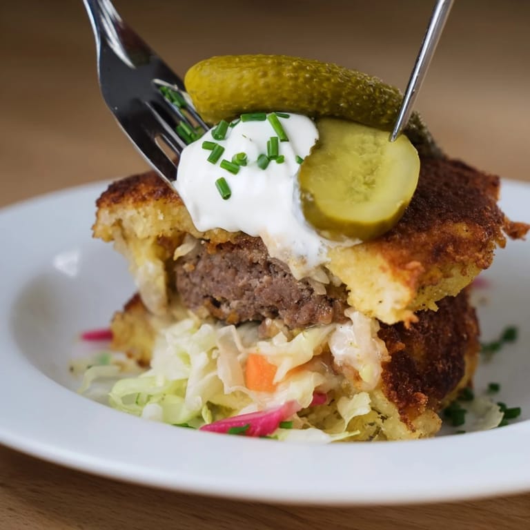 Zapisz Chrupiące placki ziemniaczane w roli „bułki”, soczyste kotleciki wołowe i kwaśne warzywa marynowane – oto pomysłowe placki Rebel Float Sliders. Danie łączy komfort kuchni wschodnioeuropejskiej z klasyczną amerykańską przekąską.