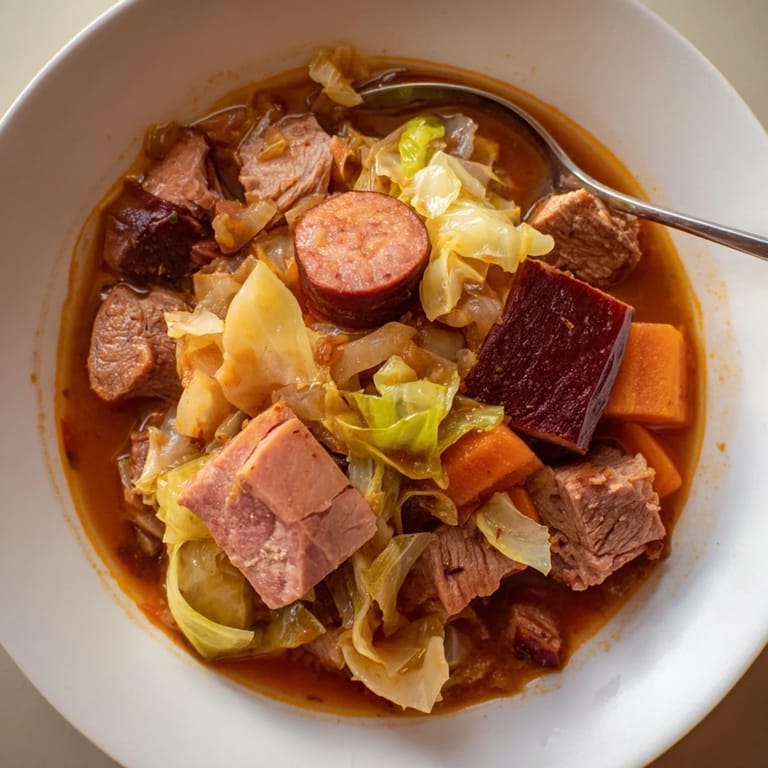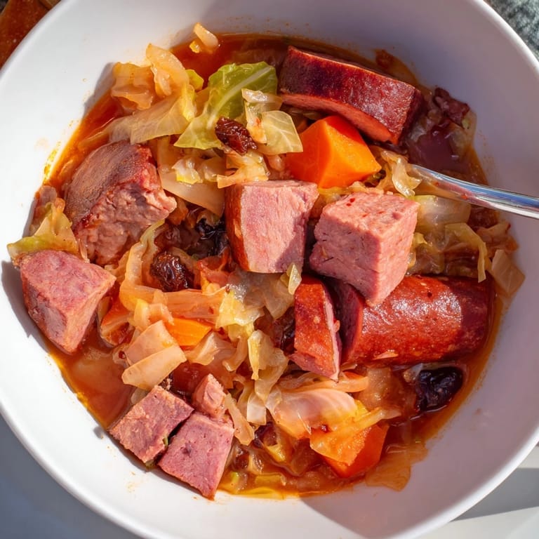 Zapisz Tradycyjny polski bigos z wyrazistym połączeniem mięs, kapusty kiszonej, świeżej kapusty i aromatycznych przypraw. Duszony powoli dla głębi smaku, idealny na zimne dni i spotkania z rodziną.