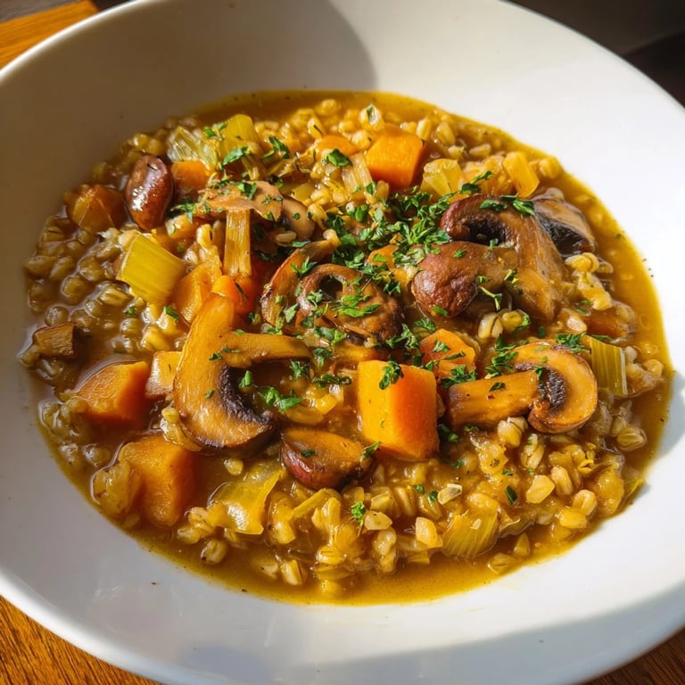 Zapisz Rustykalny gulasz z jęczmieniem i pieczarkami to sycąca, ziemista potrawa z delikatnym jęczmieniem, aromatycznymi pieczarkami i warzywami duszonymi do perfekcji. Idealny na rozgrzewający posiłek w chłodne dni.