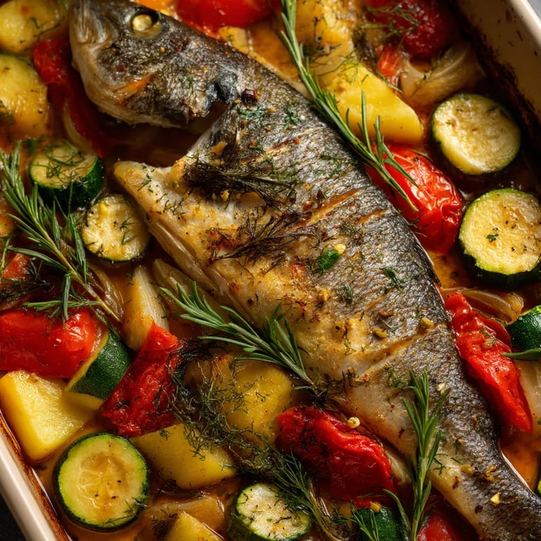 Delikatna biała ryba pieczona z warzywami i ziołami. Doskonała na lekki obiad, łatwa w przygotowaniu.