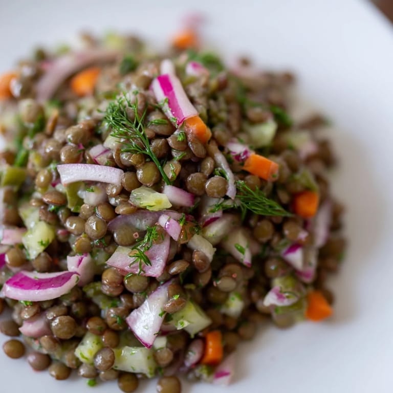Zapisz Syta, białkowa sałatka z soczewicą o ziemistym smaku, chrupiącymi warzywami i wyrazistym sosem musztardowym – idealna jako dodatek lub lekki posiłek, inspirowana tradycyjnymi polskimi smakami.