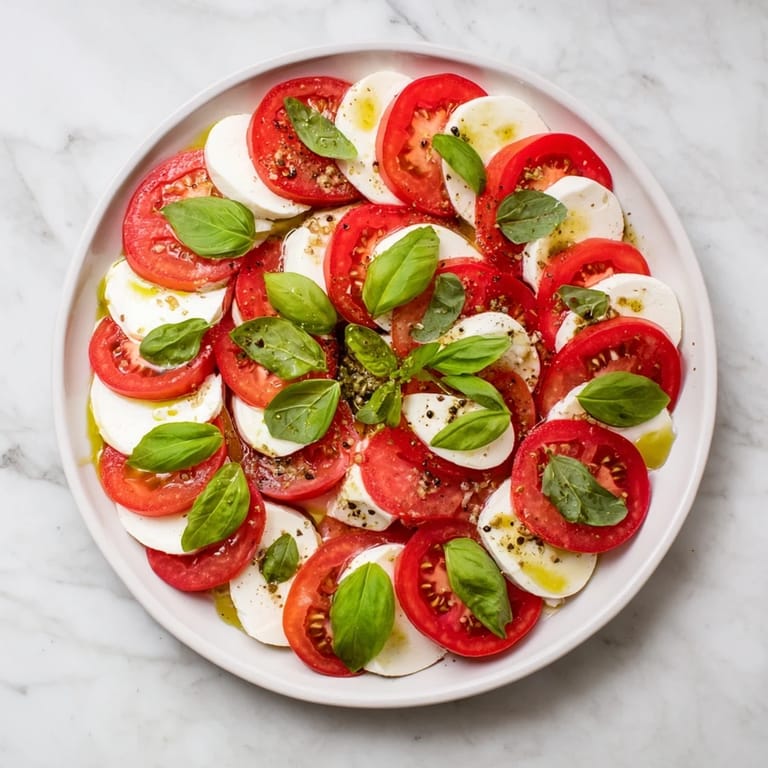 Zapisz Świeża i żywa przekąska na brunch z soczystymi pomidorami i kremową mozzarellą, wykończona aromatyczną bazylią i skropiona oliwą z oliwek.
