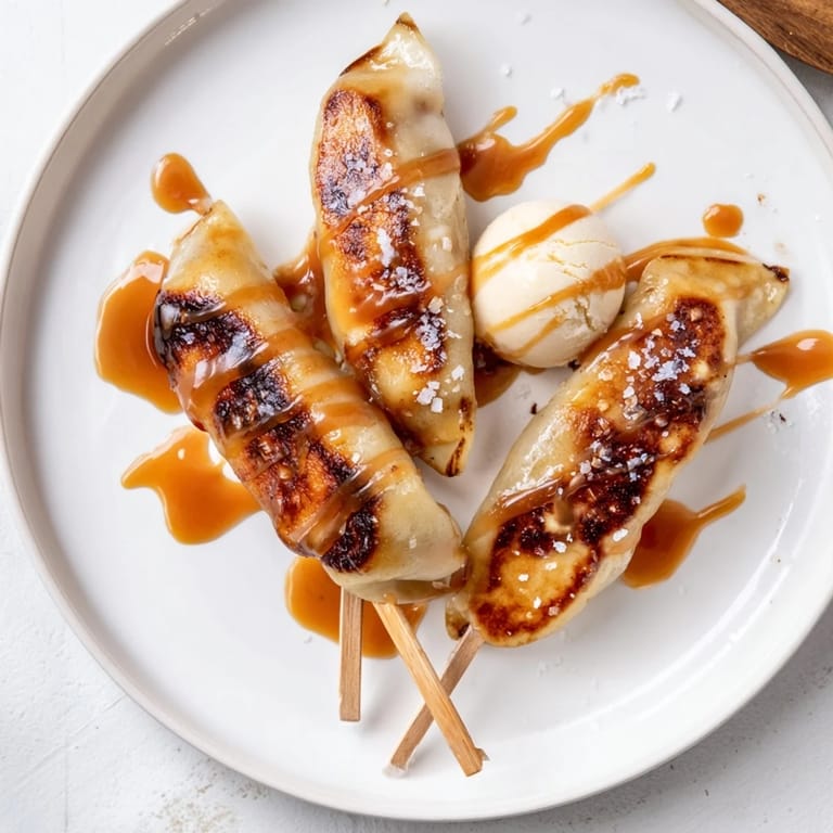 Zapisz Słodkie pierogi nadziewane jabłkami są nabite na patyczki, grillowane i polewane aksamitnym sosem karmelowym—to figlarny deser idealny na przyjęcia lub jesienne spotkania.