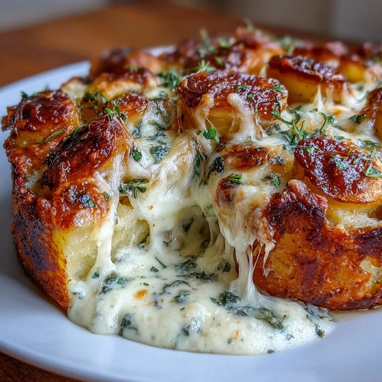 Zapisz Nestled between tradition and indulgence, the Creamy Smashed Potato Gratin transforms humble potatoes into a masterpiece of texture and flavor. This French-inspired dish elevates the simple spud with a technique that creates the perfect contrast: crispy, golden exteriors giving way to creamy, tender centers, all embraced by a rich herb-infused cream and a trio of melted cheeses that bubble and brown to perfection.
