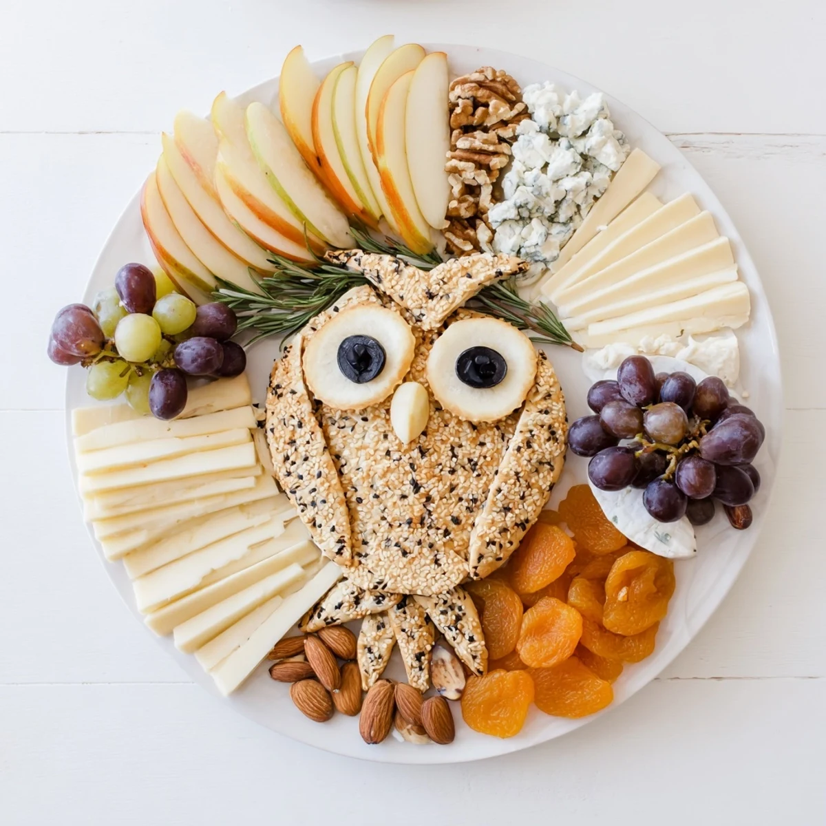 - Na dużej drewnianej desce ułóż sery w różnych sekcjach. Rozmieść ostudzone krakersy sowy wokół i pomiędzy serami. Dodaj plasterki owoców, winogrona, morele, orzechy włoskie i migdały w małych grupach. Ozdób świeżymi gałązkami rozmarynu i jadalnymi kwiatami dla leśnego efektu.