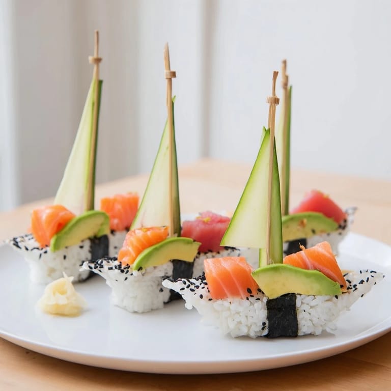 Zapisz Urocze sushi-łódki wykonane ze świeżej ryby, ryżu do sushi i chrupiących warzyw, idealne na zabawną przystawkę lub talerz imprezowy.