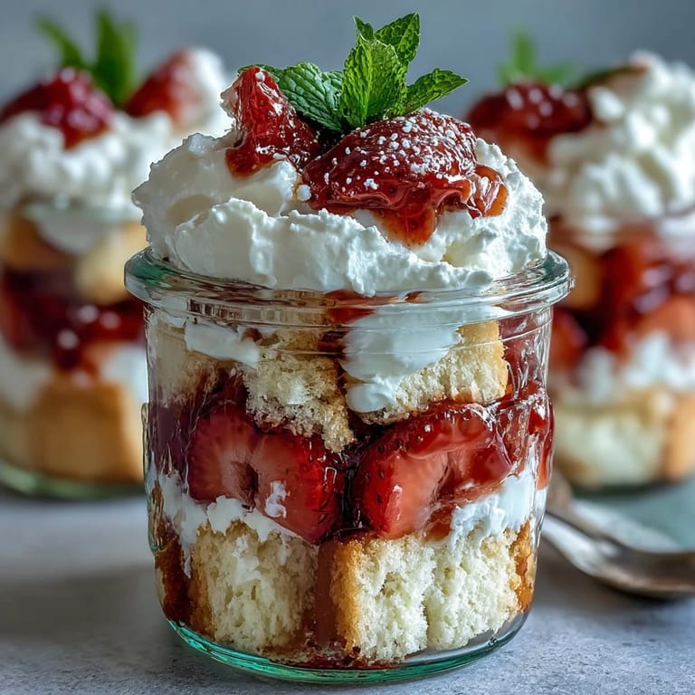 - W słoiczkach mason jar, zacznij od warstwy kostek ciasta, potem truskawki z sokami, potem puszista śmietana—powtarzaj warstwy, aż słoicze będą prawie pełne, i zakończ śmietaną z kilkoma plasterkami truskawki na górze.