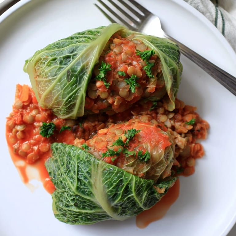 Zapisz Te wegańskie gołąbki z soczewicą to klasyka w nowoczesnym wydaniu której nie może zabraknąć w rodzinnym menu na jesień i zimę. Szlachetna kapusta wypełniona aromatycznym farszem z soczewicy, ryżu i warzyw zapieczona w kwaśno-słodkim sosie pomidorowym tworzy rozgrzewające i sycące danie główne które zachwyca nawet mięsożerców.