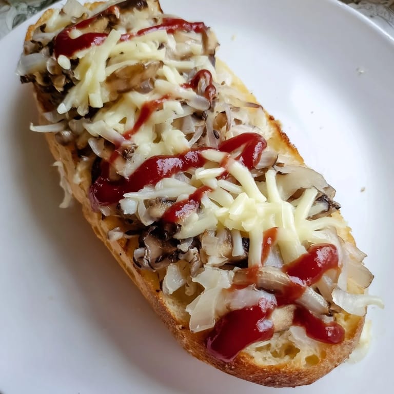 Zapisz Chrupiąca, otwarta bagietka z podsmażonymi pieczarkami, serem oraz ketchupem—to klasyczna polska zapiekanka w wersji budżetowej.