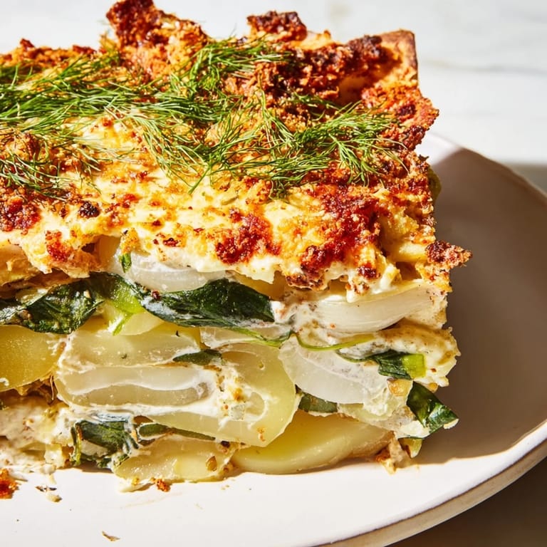 - Powtórz warstwowanie z resztą ziemniaków, cebuli, czosnku, szpinaku i ogórków.