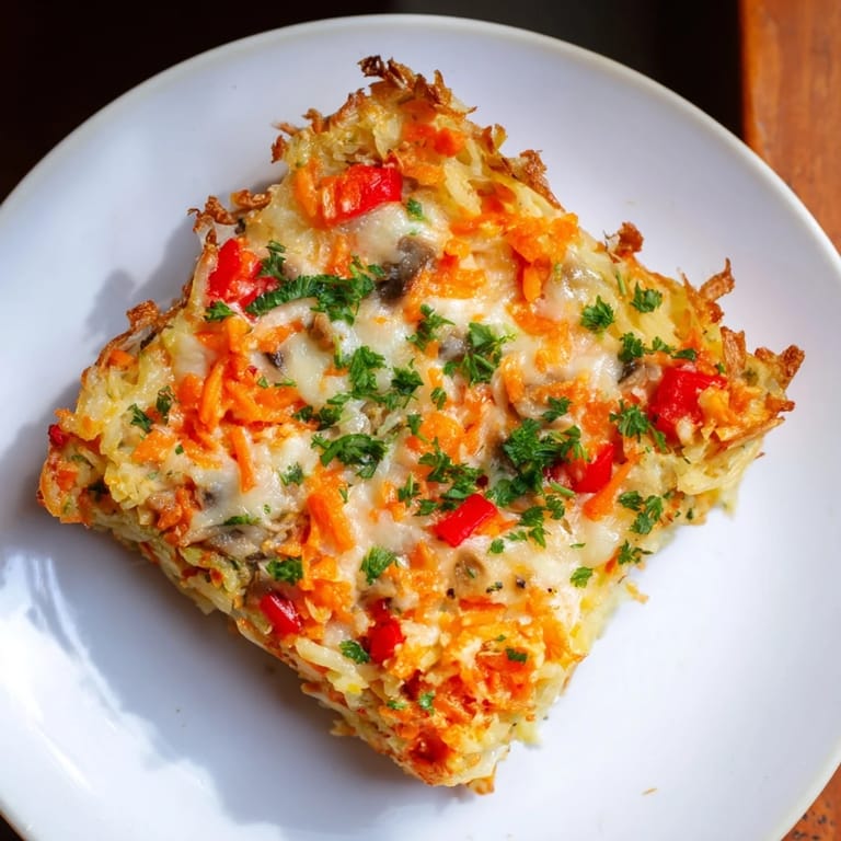 Zapisz Syta zapiekanka z chrupiącą ziemniaczaną skorupką, inspirowana kuchnią polską, wypełniona podsmażanymi warzywami i kremowym serem, idealna na sycący posiłek wegetariański.