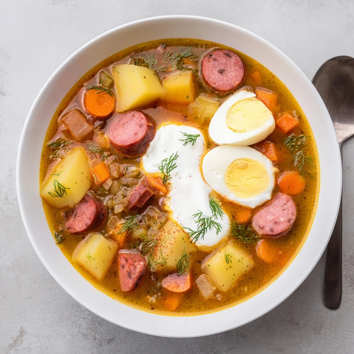 Żurek najlepiej smakuje podany z chrupiącym żytnim chlebem oraz świeżo posiekanym koperkiem.