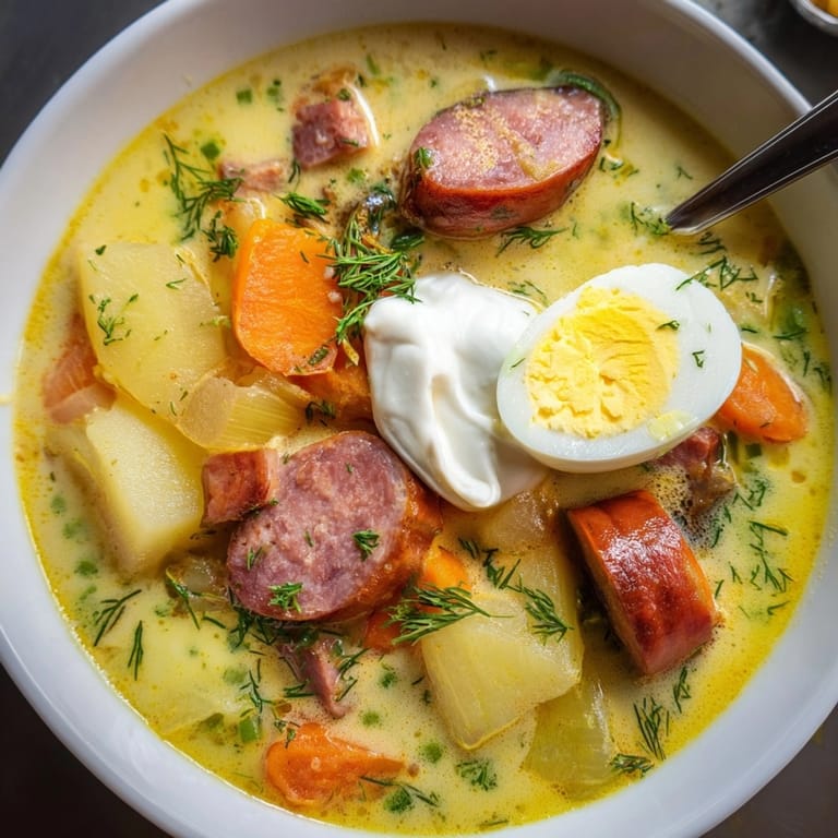 Zapisz Ten kremowy żurek z wędzoną kiełbasą rozgrzewa dom nawet w najbardziej pochmurne dni i niezawodnie pojawia się na naszym stole podczas wielkanocnych świąt. Polskie tradycyjne smaki, aksamitna konsystencja i wyraźny zapach chrzanu sprawiają, że to danie szybko staje się ulubioną zupą całej rodziny.