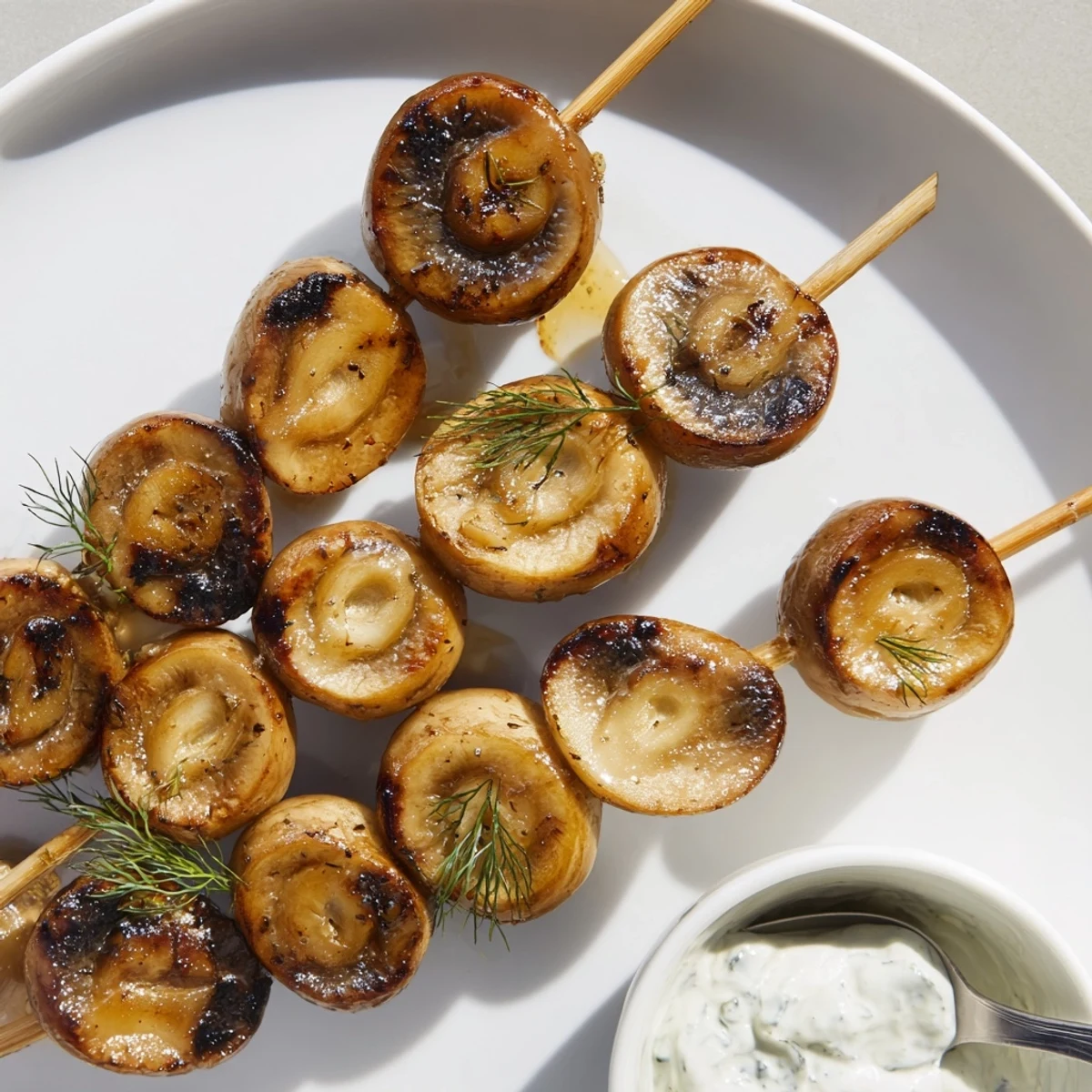 Grzyby w aromatycznej marynacie, grillowane, serwowane z kremowym sosem z ogórków i koperku.