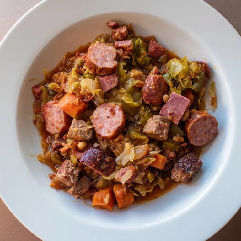 - Mięsa: 700 g łopatki wieprzowej (pokrojonej w kostkę 2 cm), 500 g łopatki wołowej (pokrojonej w kostkę 2 cm), 400 g kiełbasy polskiej wędzonej (pokrojonej w plastry), 300 g boczku wędzonego lub surowego, 250 g szynki wędzonej (pokrojonej w kostkę)