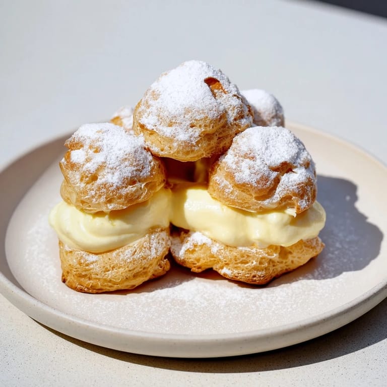 Puszyste ciasto parzone z aksamitnym kremem waniliowym i delikatnym cukrem pudrem.